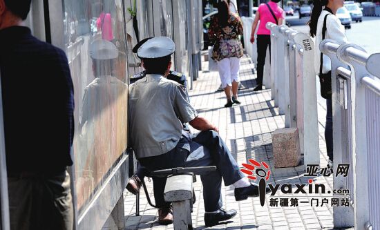 隨后,記者來到烏市前進街(兵團二中正門對面)公交車站,一位女性安保人員戴著墨鏡坐在椅子上。10分鐘內,公交車到站,行人爭相上車,她只是偶爾抬頭張望。離她不足3米處的一張空椅上,有一頂帽子和安檢儀。記者詢問她空椅上的人去哪了,該執勤人員并未搭理。